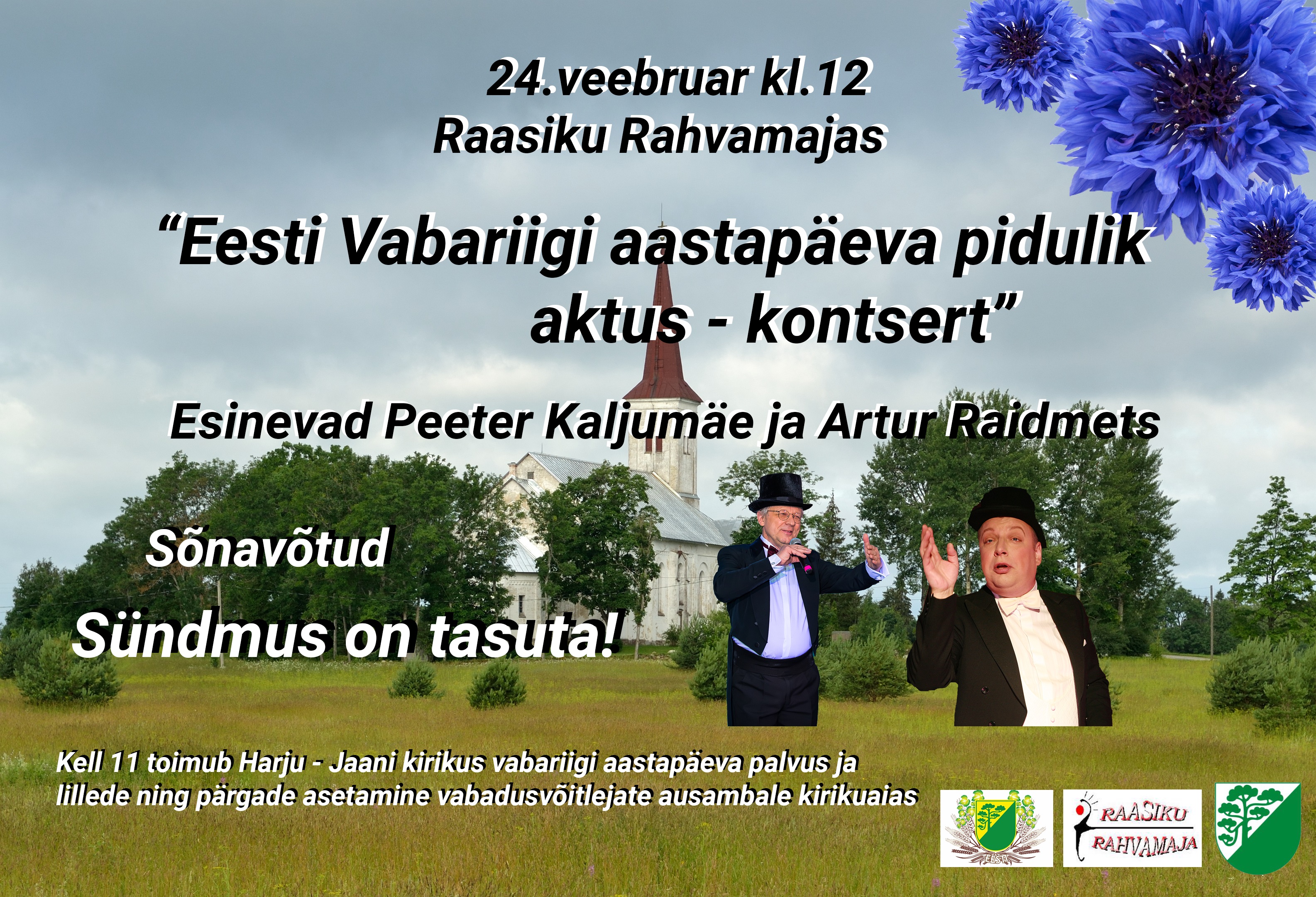 Eesti Vabariigi aastapäeva pidulikule aktus – kontserdile on kutsutud esinema Peeter Kaljumäe ja Artur Raidmets. Sõna võtavad Raasiku vallavanem Andre Sepp ja volikogu esimees Tiina Rühka. Enne aktus – kontserti toimub kell 11 Harju -Jaani kirikus vabariigi aastapäeva palvus ja lillede ning pärgade asetamine vabadusvõitlejate ausambale kirikuaias.