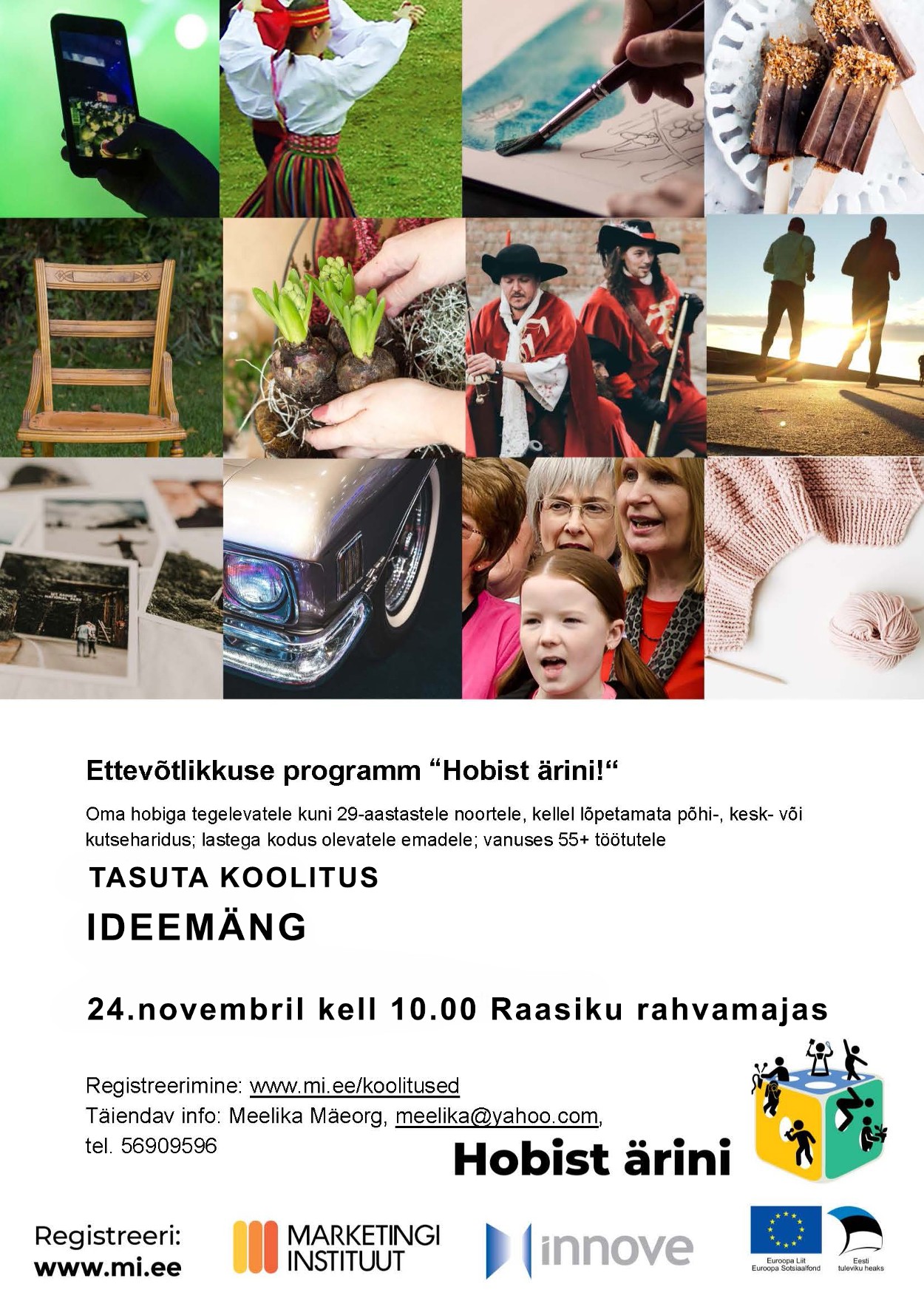 Link24.november kell 10.00 -15.30 Ernesaksa saalis ettevõtlikkuse programmi „Hobist ärini“ koolitus „IDEEMÄNG“. Koolitaja Meelika Mäeorg. Etteregistreerimine: www.mi.ee/koolitused.