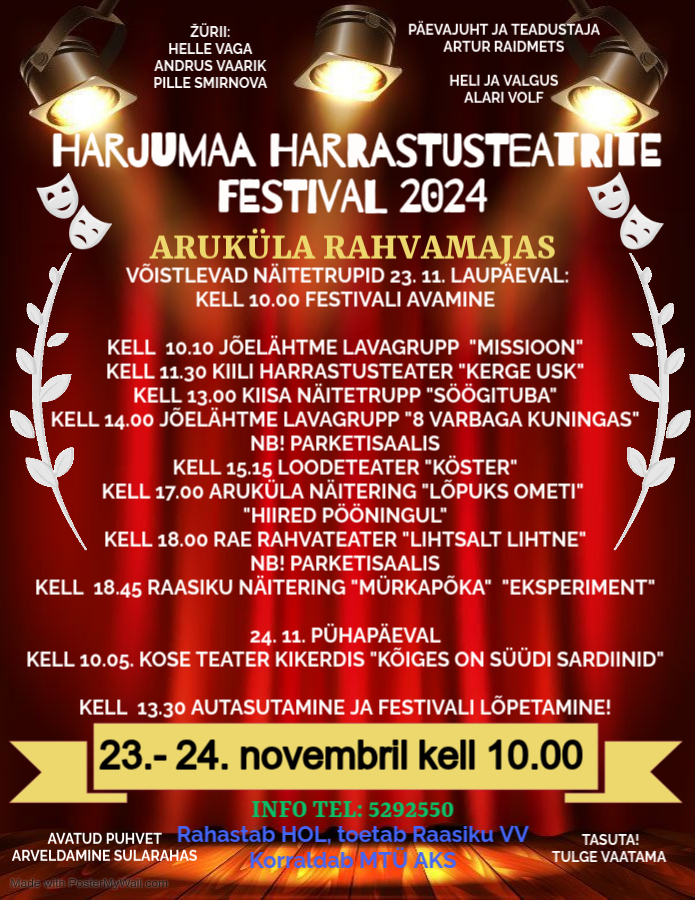“Harrastusteatrite Festival 2024” Aruküla rahvamajas 23- ja 24. novembril.