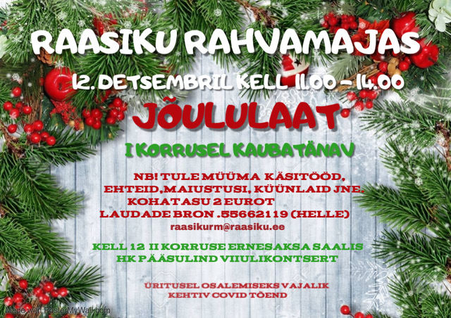 Esimesele korrusele planeerime kaubatänava. Ootame  inimesi müüma  oma käsitööd, ehteid, maiustusi, küünlaid jne. Müügilaua kohatasu on 2 eurot. Koha broneerimine on soovitav varakult ära teha. Helista 5566 2119 Hellele või kirjuta raasikurm@raasiku.ee meilile. Kell 12 toimub II korruse Ernesaksa saalis HK Pääsulind viiuliõpilaste kontsert.