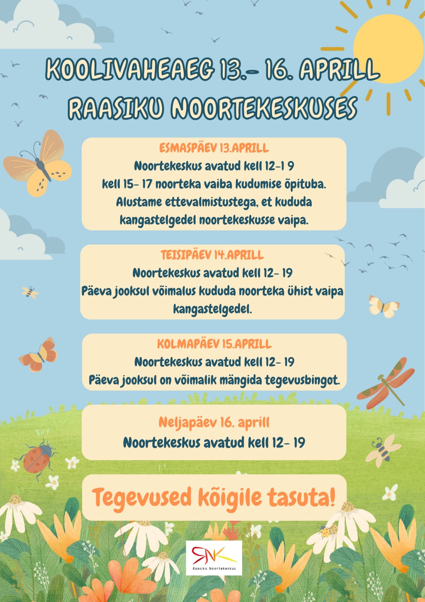 K 15.aprill noortekas avatud kell 12-19, päeva jooksul on võimalik mängida tegevusbingot. Tublimatele auhinnad!