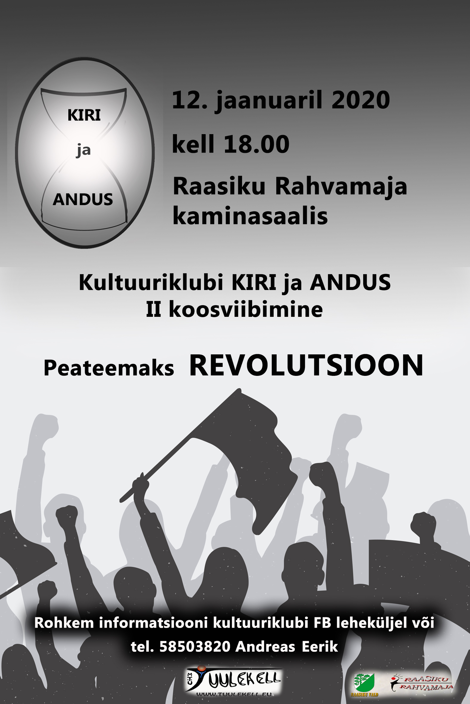 12.jaanuar kl.18 rahvamaja kaminasaalis KULTUURIKLUBI KIRI ja ANDUS II koosviibimine. Peateemaks „REVOLUTSIOON“ Info tel.58503820 (Andreas Eerik) Tasuta!