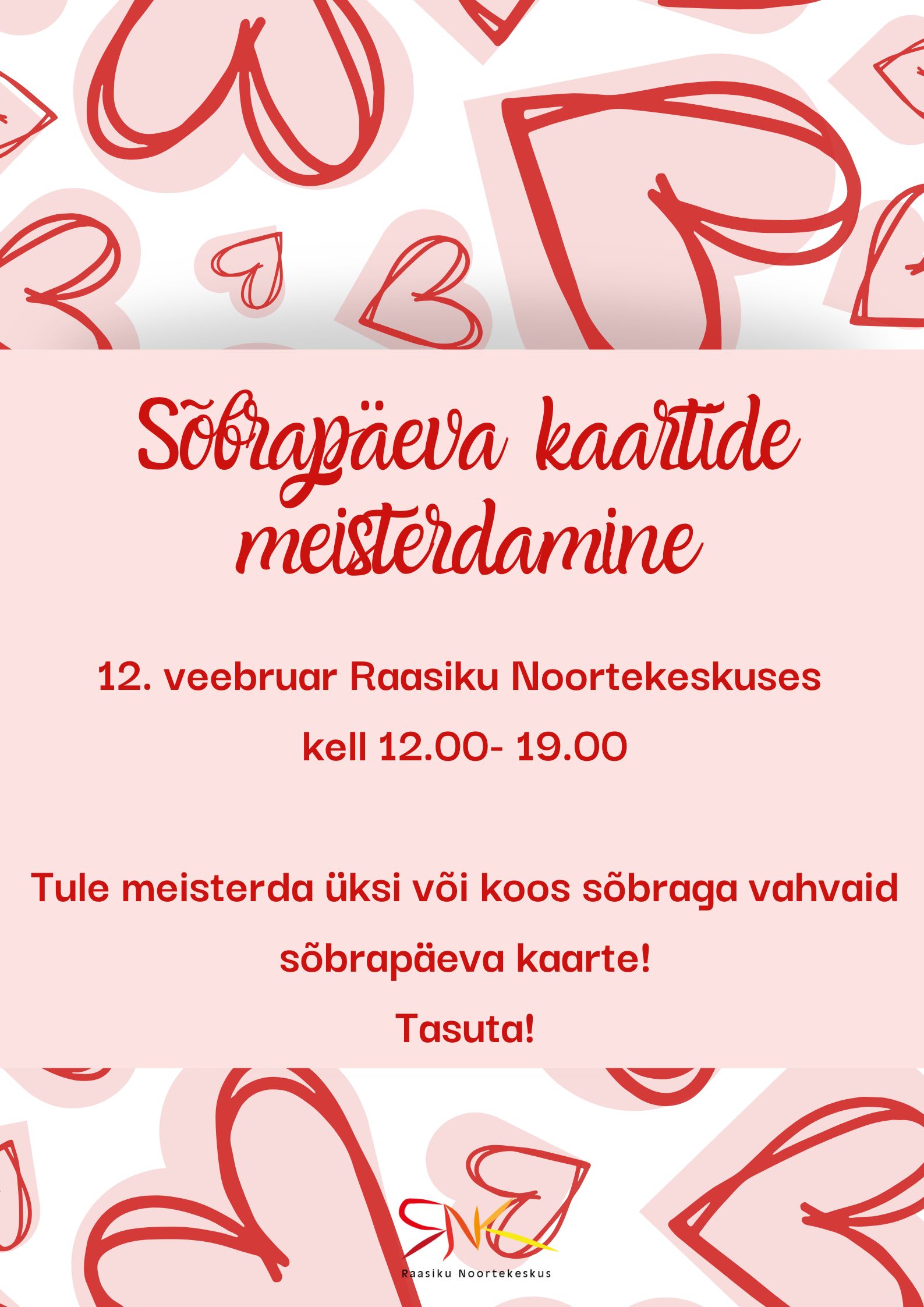 Link12.veebruar kell 12.00- 19.00 Sõbrapäeva kaartide meisterdamine Raasiku Noortekeskuses. Tasuta!