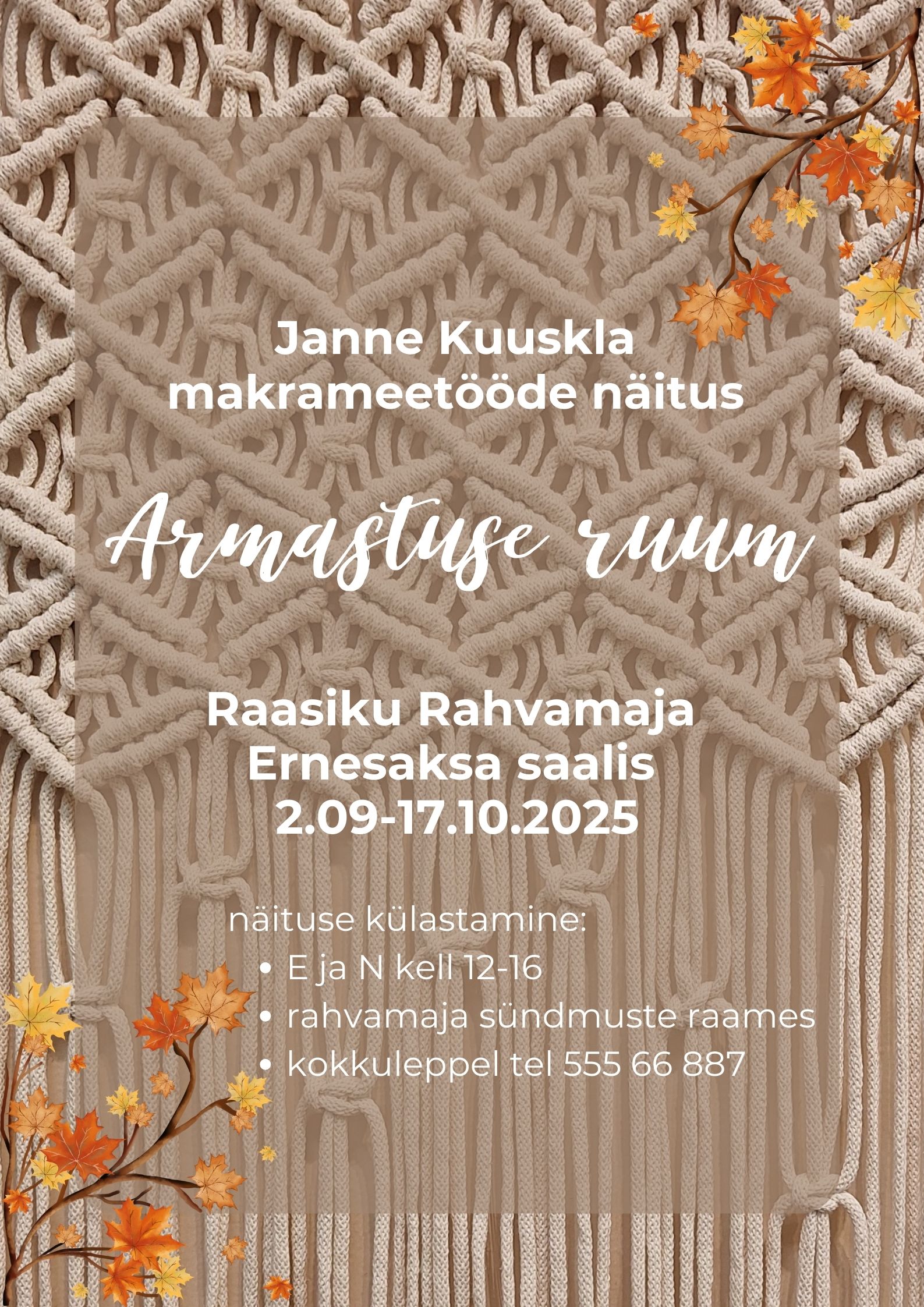 Raasiku Rahvamaja Ernesaksa saalis  Janne Kuuskla makrameetööde näitus ARMASTUSE RUUM