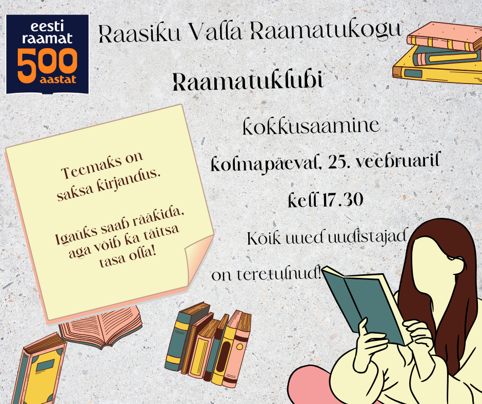 LinkOotame kõiki raamatusõpru 25. veebruaril kell 17.30 Raasiku raamatukogu raamatuklubi kokkusaamisele, kus seekord on teemaks saksa kirjandus.