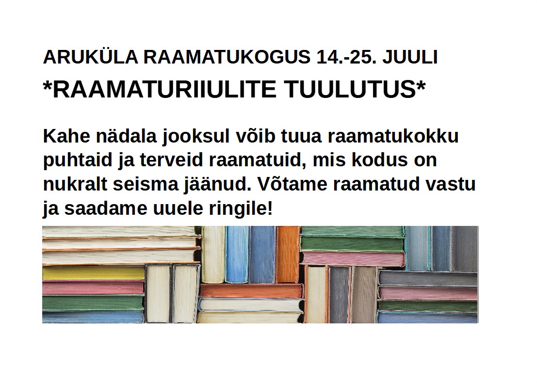 LinkKahe nädala jooksul võib tuua raamatukokku puhtaid ja terveid raamatuid, mis kodus on nukralt seisma jäänud. Võtame raamatud vastu ja saadame uuele ringile!