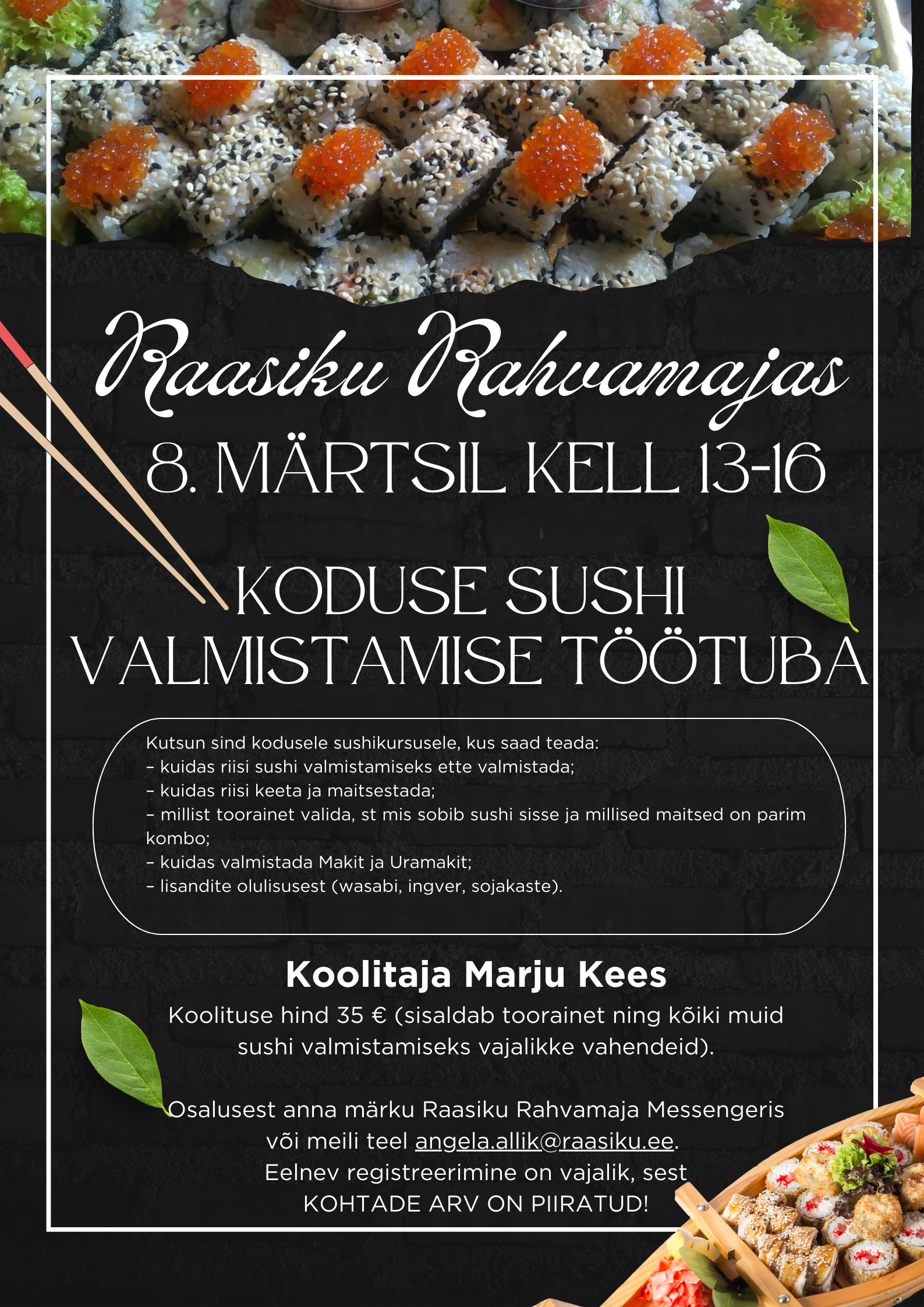 Koolituse hind 35 € (sisaldab toorainet ning kõiki muid sushi valmistamiseks vajalikke vahendeid)