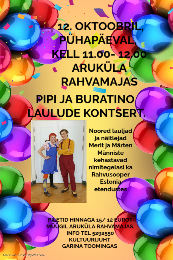 12. oktoobril kell 11 Aruküla rahvamajas PIPI ja BURATINO laulude kontsert. Pilet täiskasvanule15 €, laps, pensionär 12 eurot. Piletid müügil PILETIMAAILMAS Aruküla rahvamajas.
