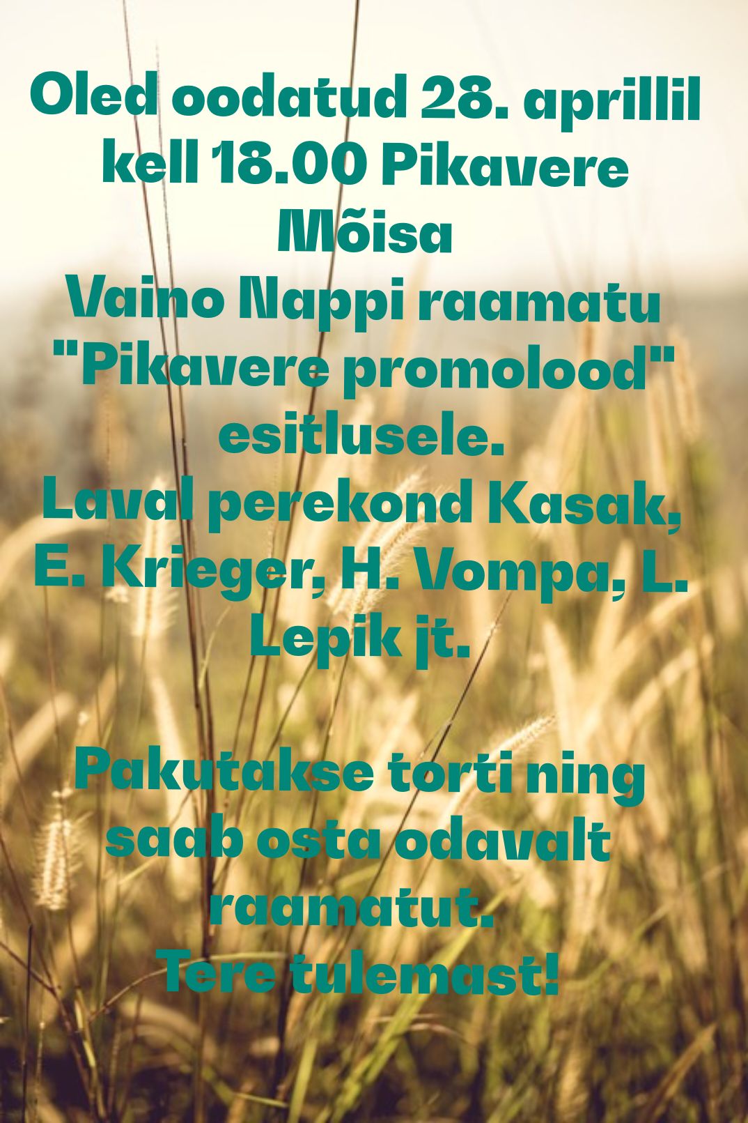 - aprillil kell 18.00 toimub Pikavere Mõisas Vaino Napi raamatu „Pikavere promolood“ esitlus.