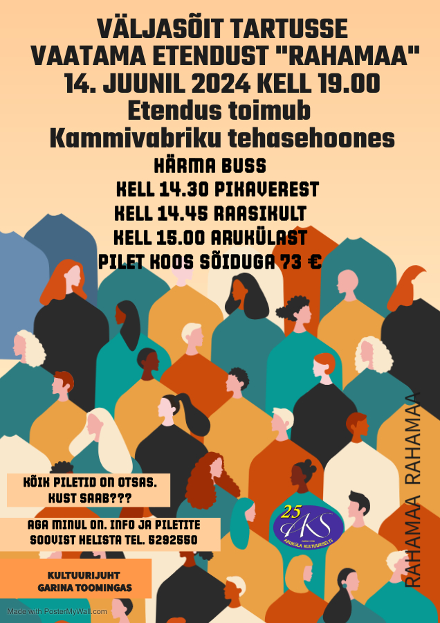 LinkVäljasõit kell 14.30 Pikaverest, kell 14.45 Raasikult ja kell 15.00 Arukülast. Tikupoisis peatus sinna ja tagasi tulles. Piletite soovist palun helista tel. 5292550