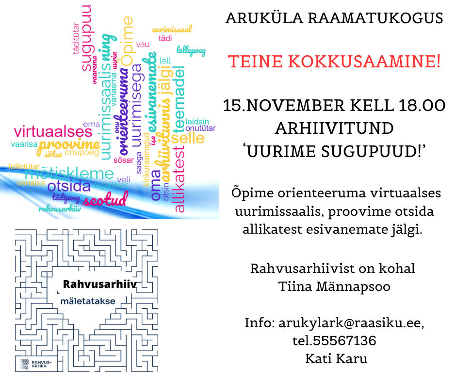 Rahvusarhiiviga koostöös toimuvad Aruküla raamatukogus kokku neli arhiivitundi, kus räägitakse täpsemalt Rahvusarhiivist, digitaalsetest andmebaasidest, erinevatest säilikutest ja paljust muust huvitavast.