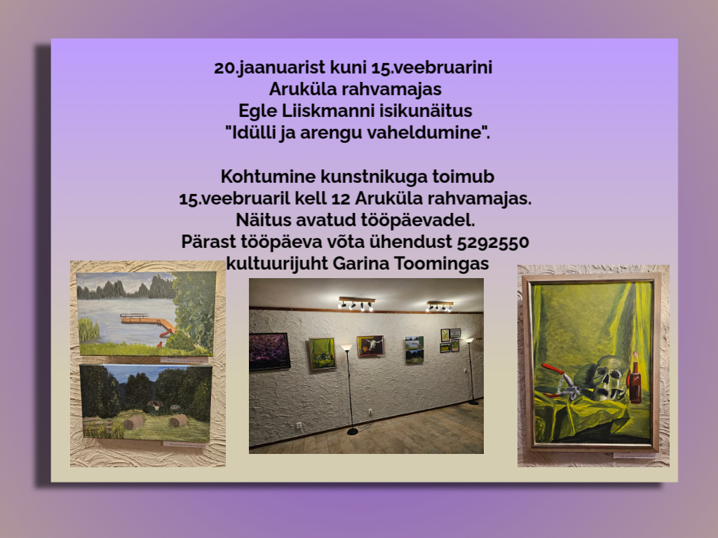 Näitus on avatud 18. jaanuarist 15. veebruarini Aruküla kultuurimajas. Näitust saab vaatamas käia rahvamaja lahtiolekuaegadel, tööpäevadel kell 8.00 kuni 17.00, teistel aegadel kokkuleppel kultuurijuhiga tel. 5292550. Kunstnikuga kohtumine toimub 15. veebruaril kl 12, huvilistel on hea võimalus tutvuda näitusega ja rääkida maalidest.