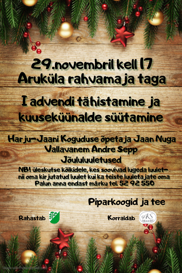 Süütame I advendiküünla juba sellel pühapäeval. Rahvamaja taga jõulukuuse juures tervitavad Harju- Jaani Koguduse õpetaja Jaan Nuga ja vallavanem Andre Sepp. Jõululuuletuste LUGEMINE. Luuletuse esitamise soovist teada anda tel 529 2550 või aadressil garina@kultuuriselts.eu.