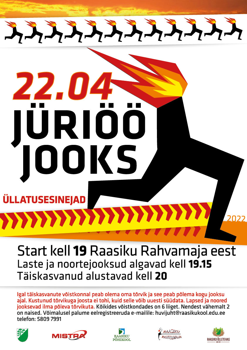 LinkPeale 2 aastast pausi tuleb see taas – JÜRIÖÖJOOKS. Kavas on kolmes vanuseastmes teatejooksud- lasteaed+algklassid, vanem põhikooli vanuseaste ning täiskasvanud. Iga vanusegrupi esikolmik saab kaela medalid. Põleva tõrvikuga jooksevad vaid täiskasvanute meeskonnad. Jooksude vahele ootame esinema showtantsijaid ning lõpunumbriks tuleshowd. Vajalik eelnev registreerimine huvijuht@raasikukool.edu.ee