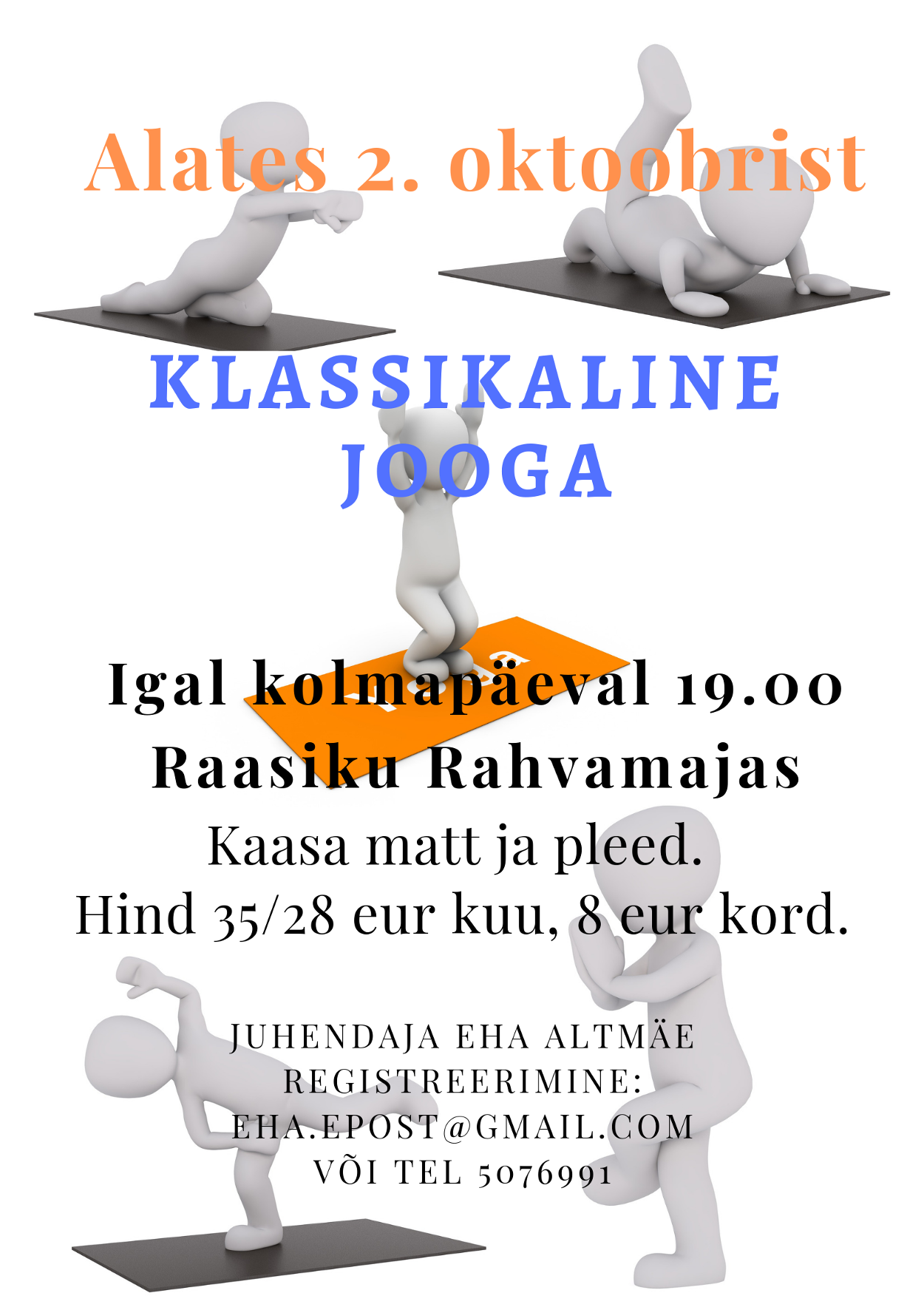2.oktoobril, kolmapäeviti kell 19.00 Klassikaline jooga. Juhendaja Eha Altmäe. Registreerimine: EHA.EPOST@gmail.com. või telefonil 5076991. Kaasa matt ja pleed. Hind 8 € kord.