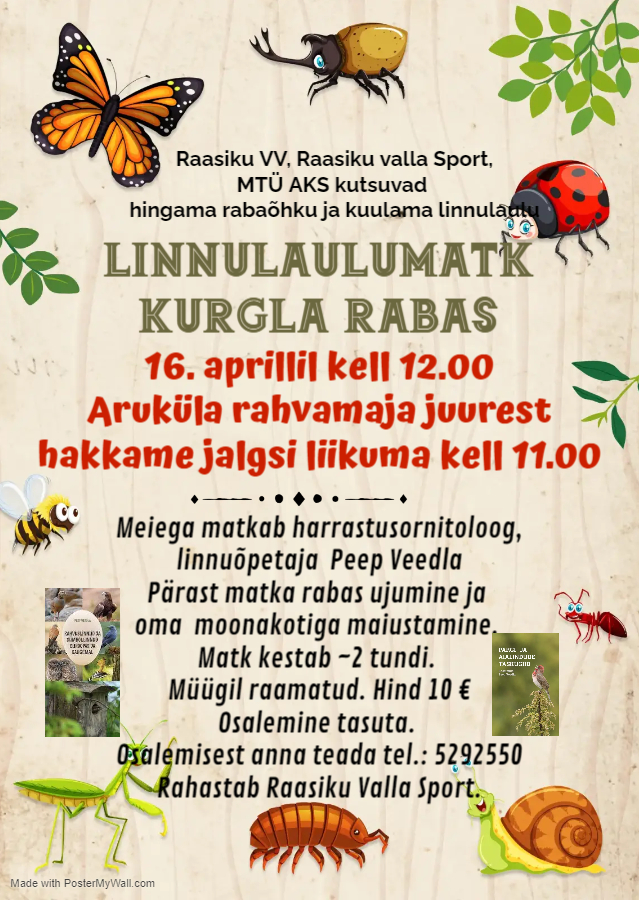 Link16. aprillil kutsuvad Raasiku VV, Raasiku Valla Sport ja MTÜ AKS hingama rabaõhku ja kuulama linnulaulu Kurgla rabasse. Toimub linnulaulu rabamatk. Kohal on hobiornitoloog Peep Veedla. Müügil tema raamatud hinnaga 10 €.