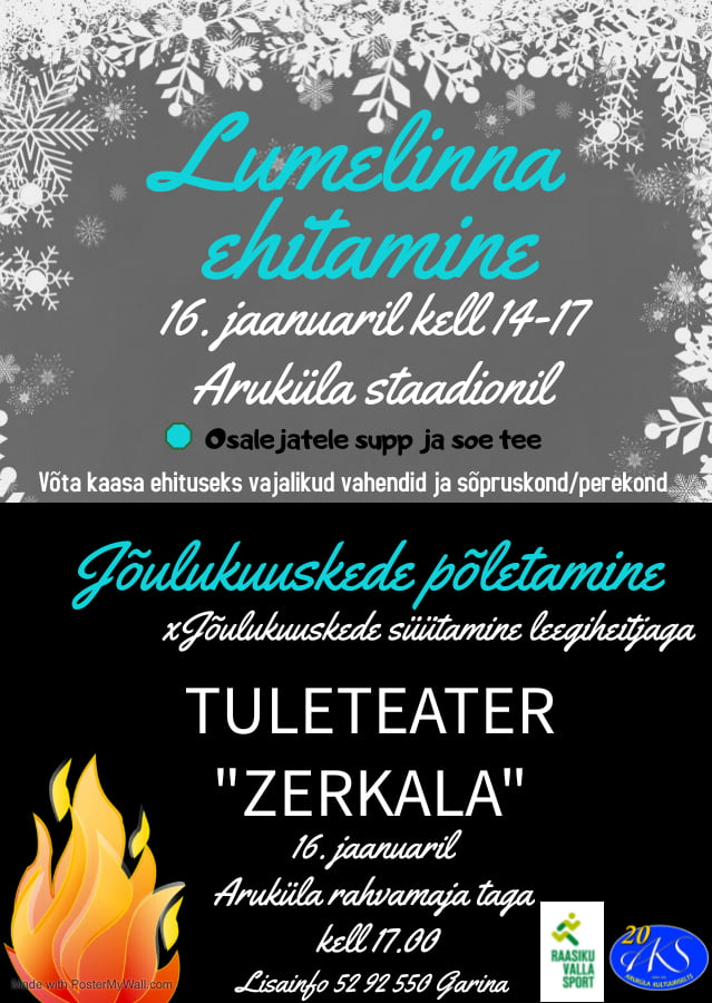 LinkKui nüüd veel lumi alles jääks siis ehitaks võimsa lumelinna. Lumelinna oodatakse ehitama seltskondi, sõpruskondi ja perekondi Aruküla staadionile kella 14.00 kuni 17.00.