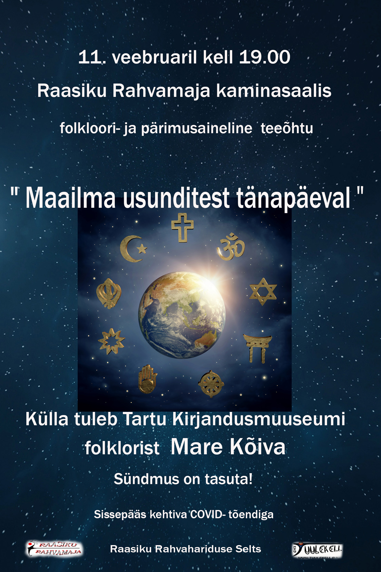 Raasiku Rahvamaja kaminasaalis folkloori- ja pärimusaineline teeõhtu. Külla tuleb Tartu Kirjandusmuuseumi folklorist Mare Kõiva.