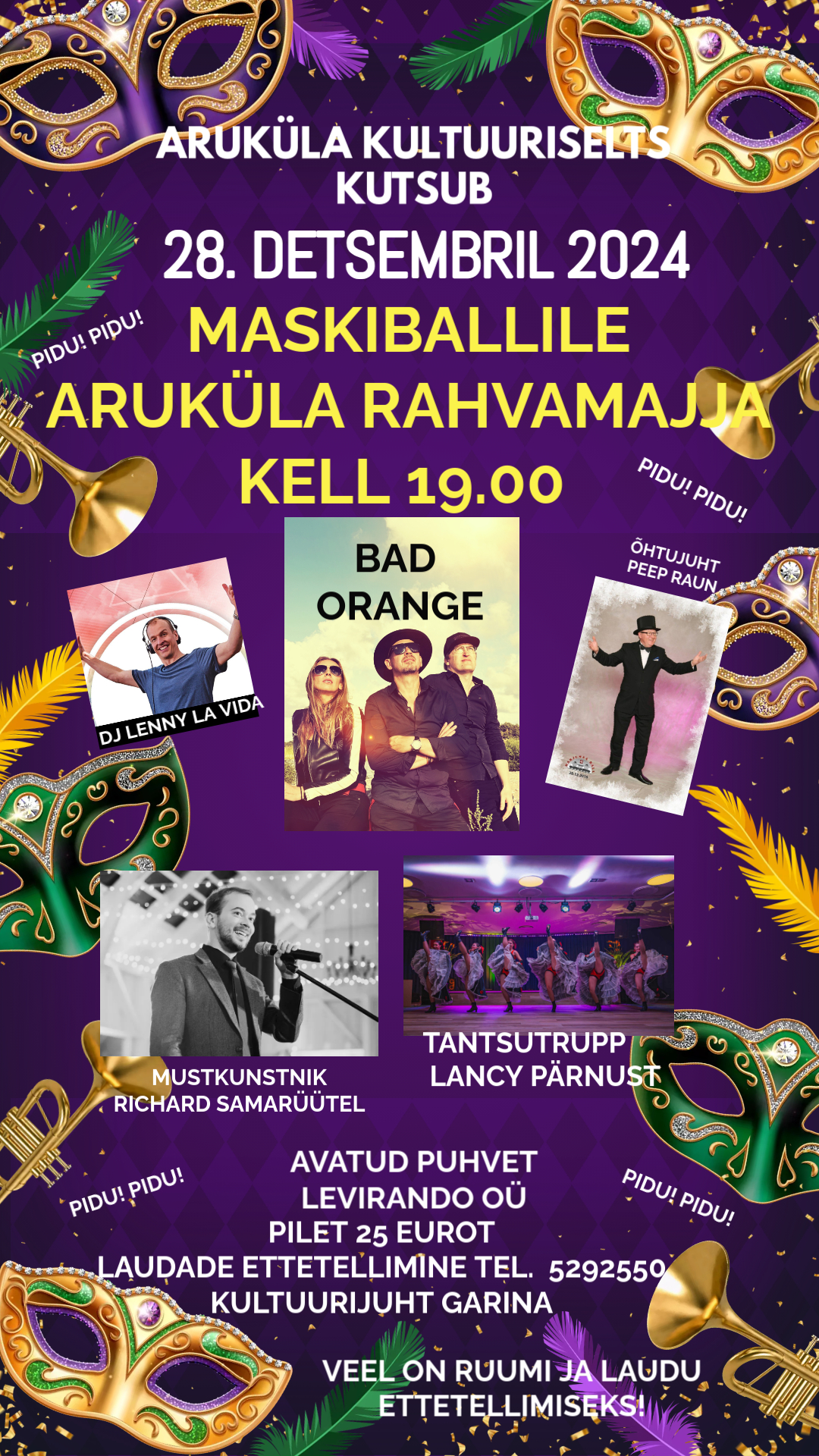 Pilet 25 eurot. Piletid müügil 27. detsembril Aruküla rahvamajas ja kohapeal maskiballile tulles.