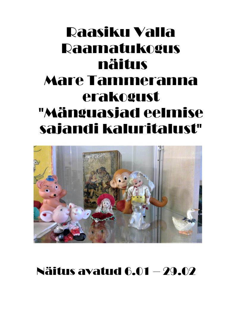 Raasiku Valla Raamatukogu klaaskapis näitus Mare Tammeranna erakogust “Mänguasjad eelmise sajandi kaluritalust”.