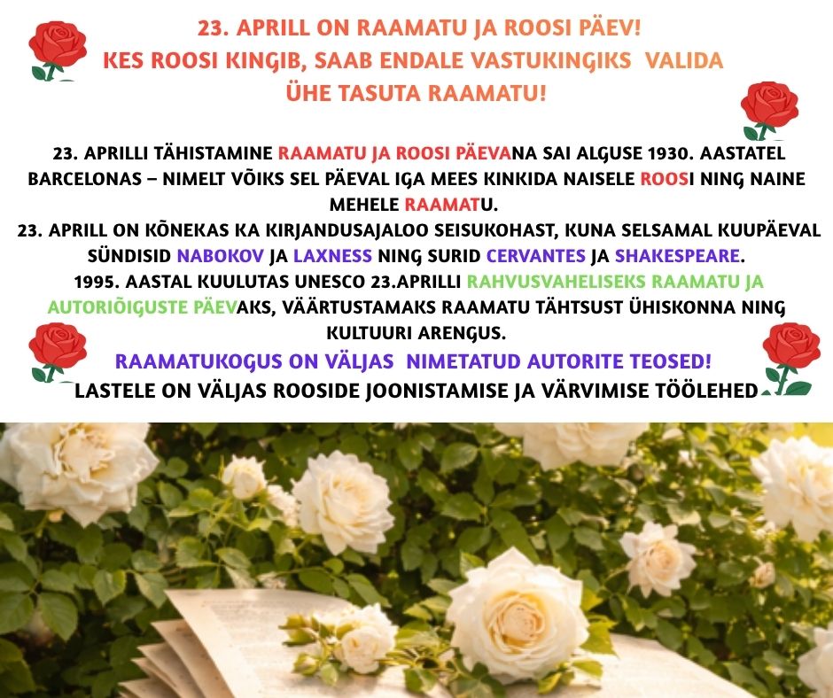 Link23. APRILL ON RAAMATU JA ROOSI PÄEV! 23. aprilli tähistamine raamatu ja roosi päevana sai alguse 1930. aastatel Barcelonas – nimelt võiks sel päeval iga mees kinkida naisele roosi ning naine mehele raamatu.