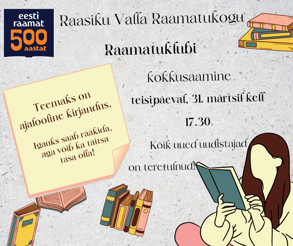 Raamatuklubi on inimestele, kellele meeldib lugeda. Kes tahab enda ümber inimesi, kes ka loevad. Igaüks võib rääkida, aga võib ka täitsa tasa olla. Kõik huvilised on oodatud!
