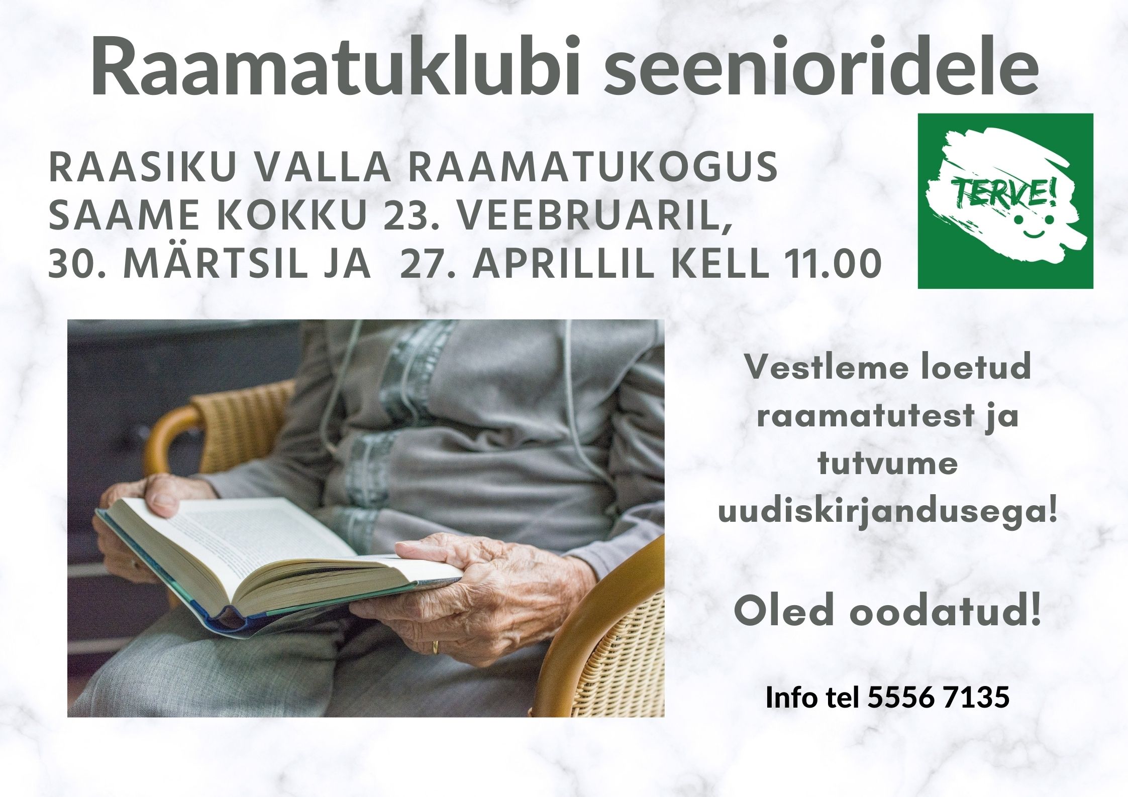 23. veebruaril kell 11.00 alustab Raasiku raamatukogus Raamatuklubi seenioritele. Ootame vanemaealisi, kellele meeldib lugeda ja loetud kirjandusest vestelda ning saada kaashuvilistelt häid lugemissoovitusi.