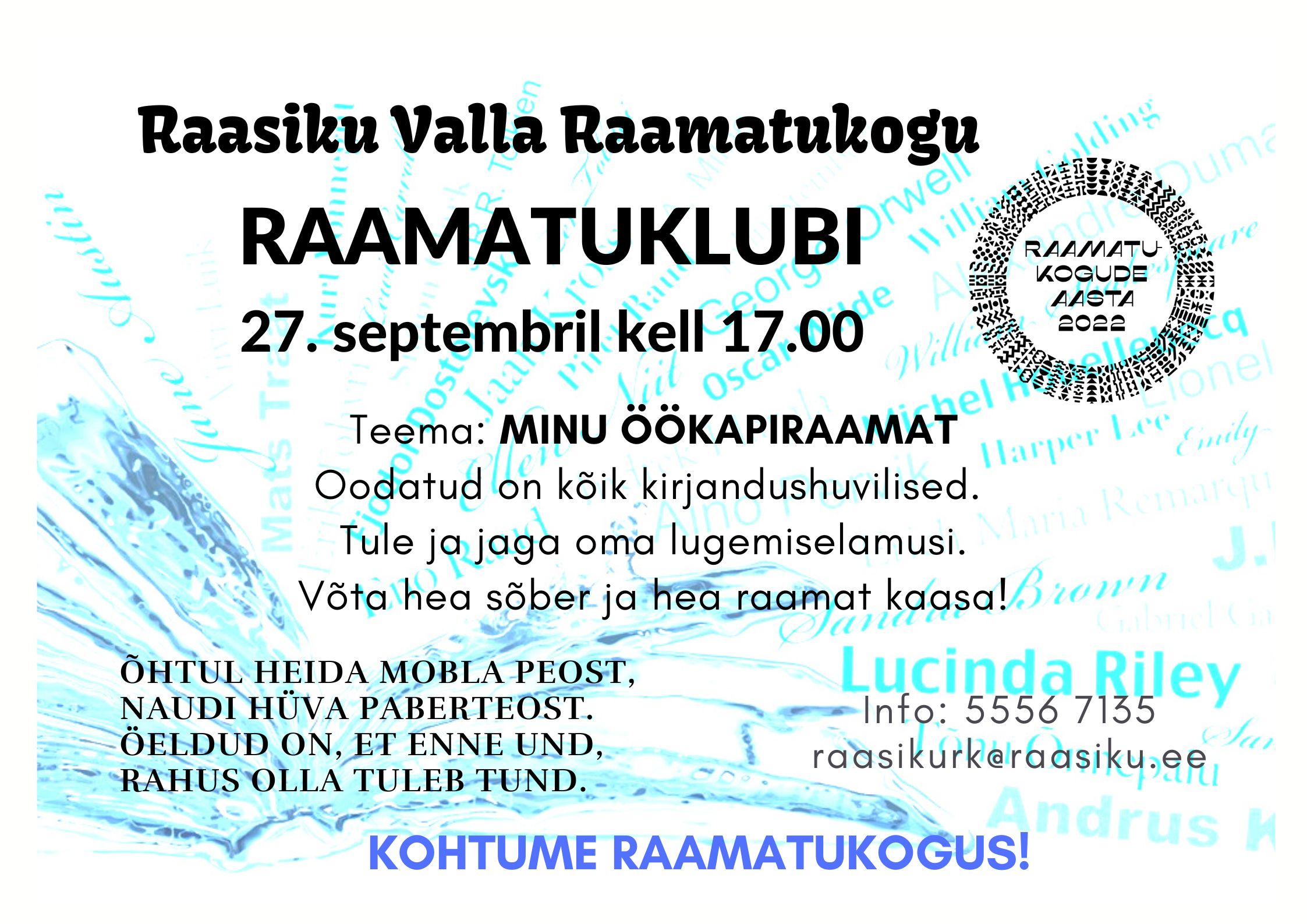 Hea raamatuhuviline, alustame taas raamatuklubi kokkusaamisi. Ootame kõiki täiskasvanuid Raasiku Valla Raamatukogusse septembrikuu viimasel teisipäeval, 27. 09 kell 17.00 . Esimene kohtumise teema: minu öökapiraamat.
