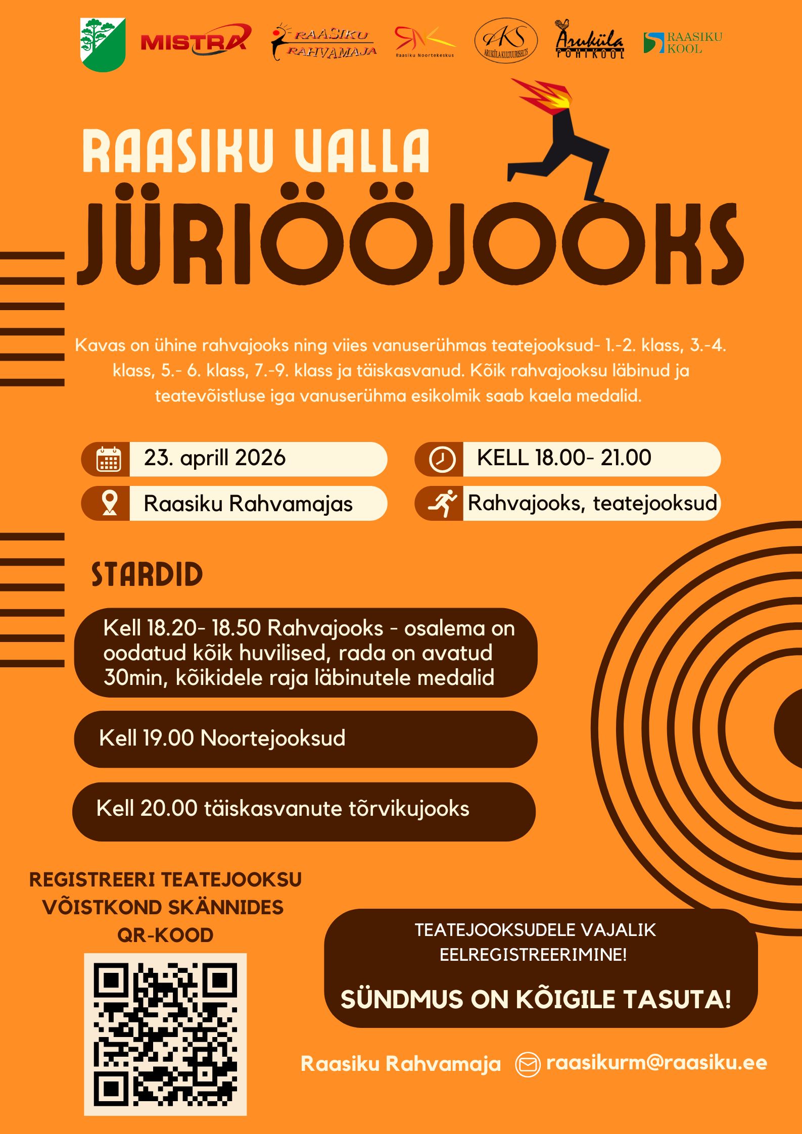 Stardid: kell 18.20 RAHVAJOOKS, osalema on oodatud kõik huvilised, rada on avatud 30 min, kõikidele raja läbinutele medalid