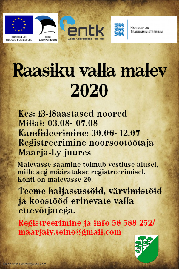 Raasiku valla malev toimub 3.august- 7.august. Malevasse on oodatud noored vanuses 13.-18.eluaastat. Kohad on täis!