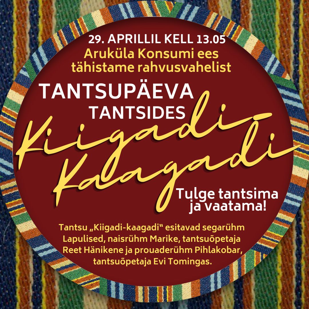Link29. aprillil kell 13.05 Aruküla Konsumi ees tähistame rahvusvahelist TANTSUPÄEVA. Tantsu „Kiigadi-kaagadi“ esitavad segarühm Lapulised, naisrühm Marike, tantsuõpetaja Reet Hänikene ja prouaderühm Pihlakobar, tantsuõpetaja Evi Tomingas.