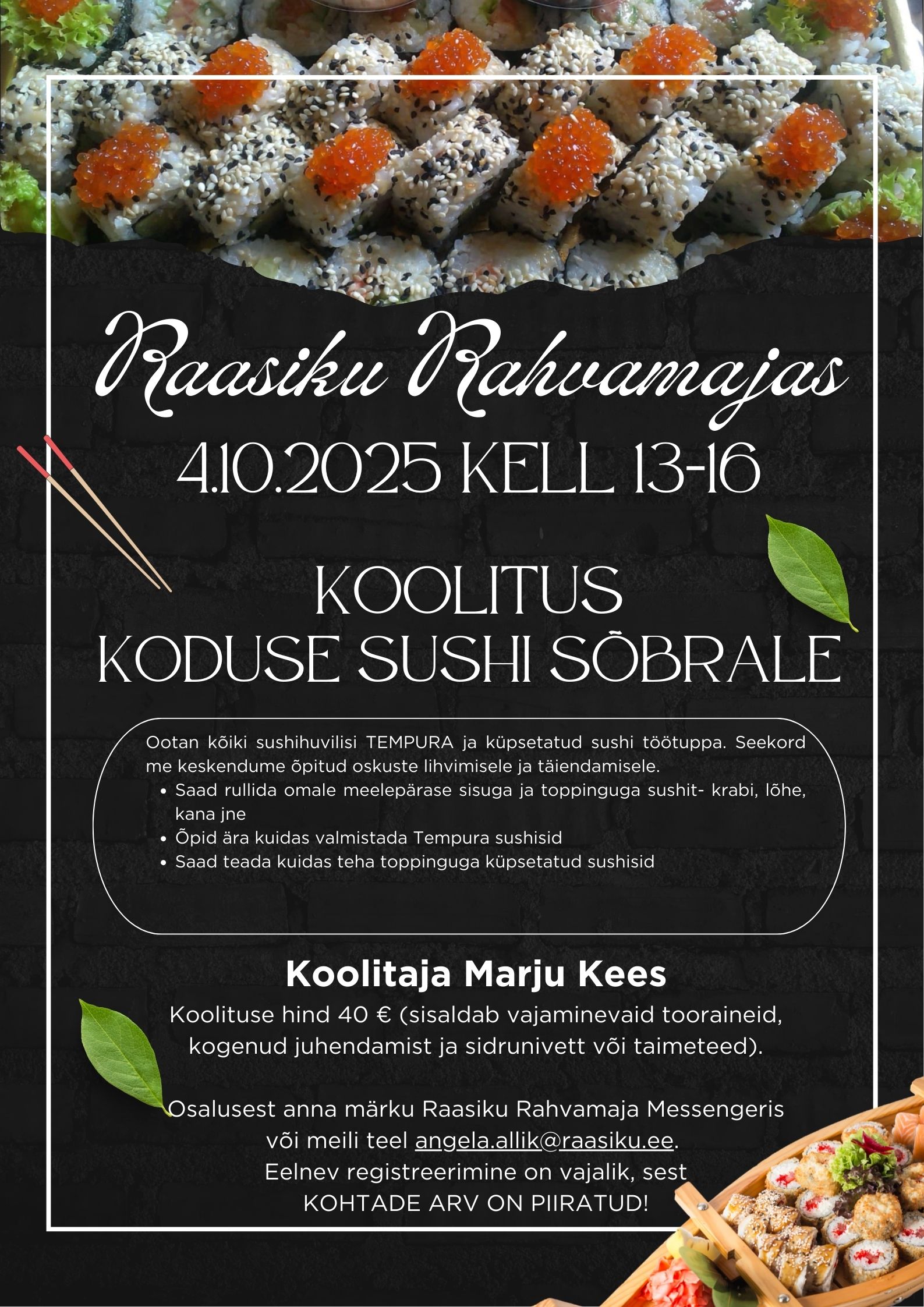 Osalusest anna märku Raasiku Rahvamaja messengeris või meili teel angela.allik@raasiku.ee.