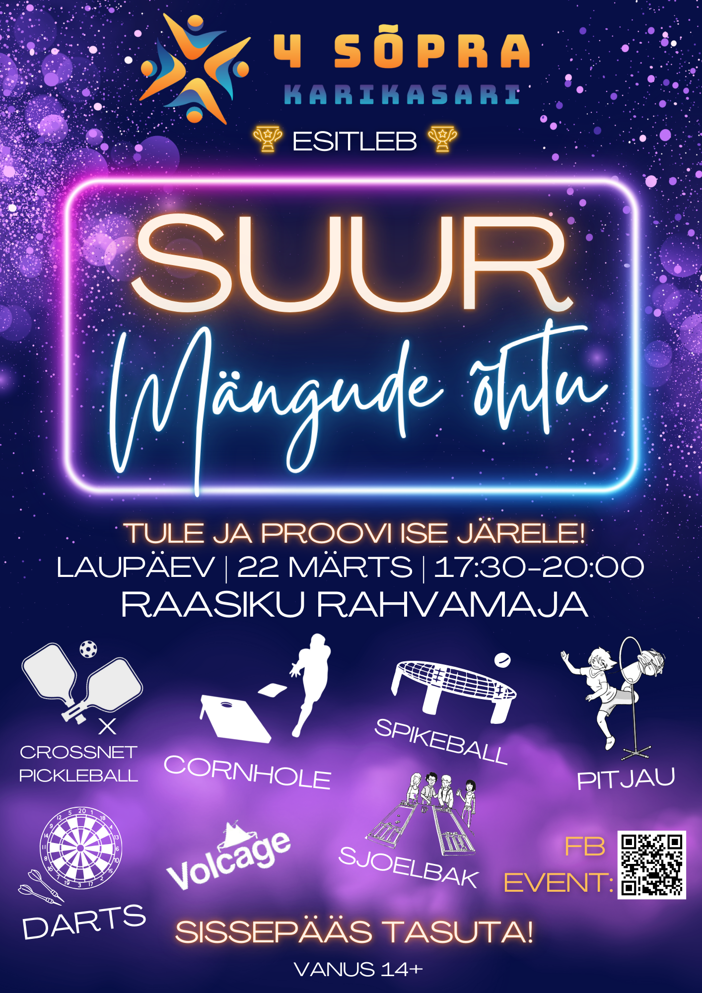 LinkOled oodatud põnevale mängude õhtule, mis toimub 𝐑𝐚𝐚𝐬𝐢𝐤𝐮 𝐫𝐚𝐡𝐯𝐚𝐦𝐚𝐣𝐚 𝐬𝐮𝐮𝐫𝐞𝐬 𝐬𝐚𝐚𝐥𝐢𝐬. See on hea võimalus proovida erinevaid vahvaid mänge nagu näiteks Cornhole, Crossnet Pickleball, Spikeball, Pitjau, Sjoelbak, Darts ja Volcage.