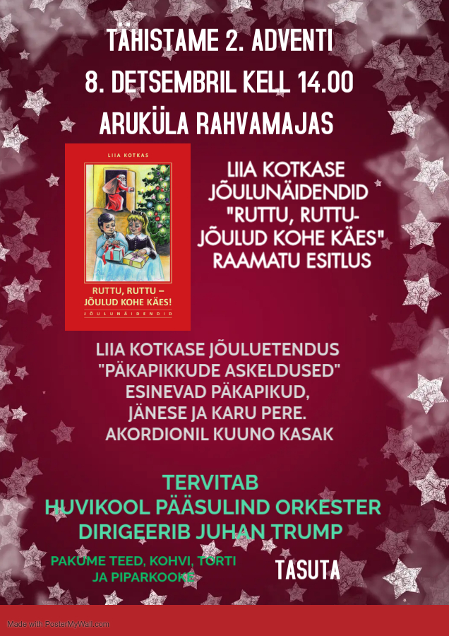 Tähistame II: adventi Liia Kotkase jõulunäidendi ja -raamatu esitlusega. Huvikool Pääsulind orkester.