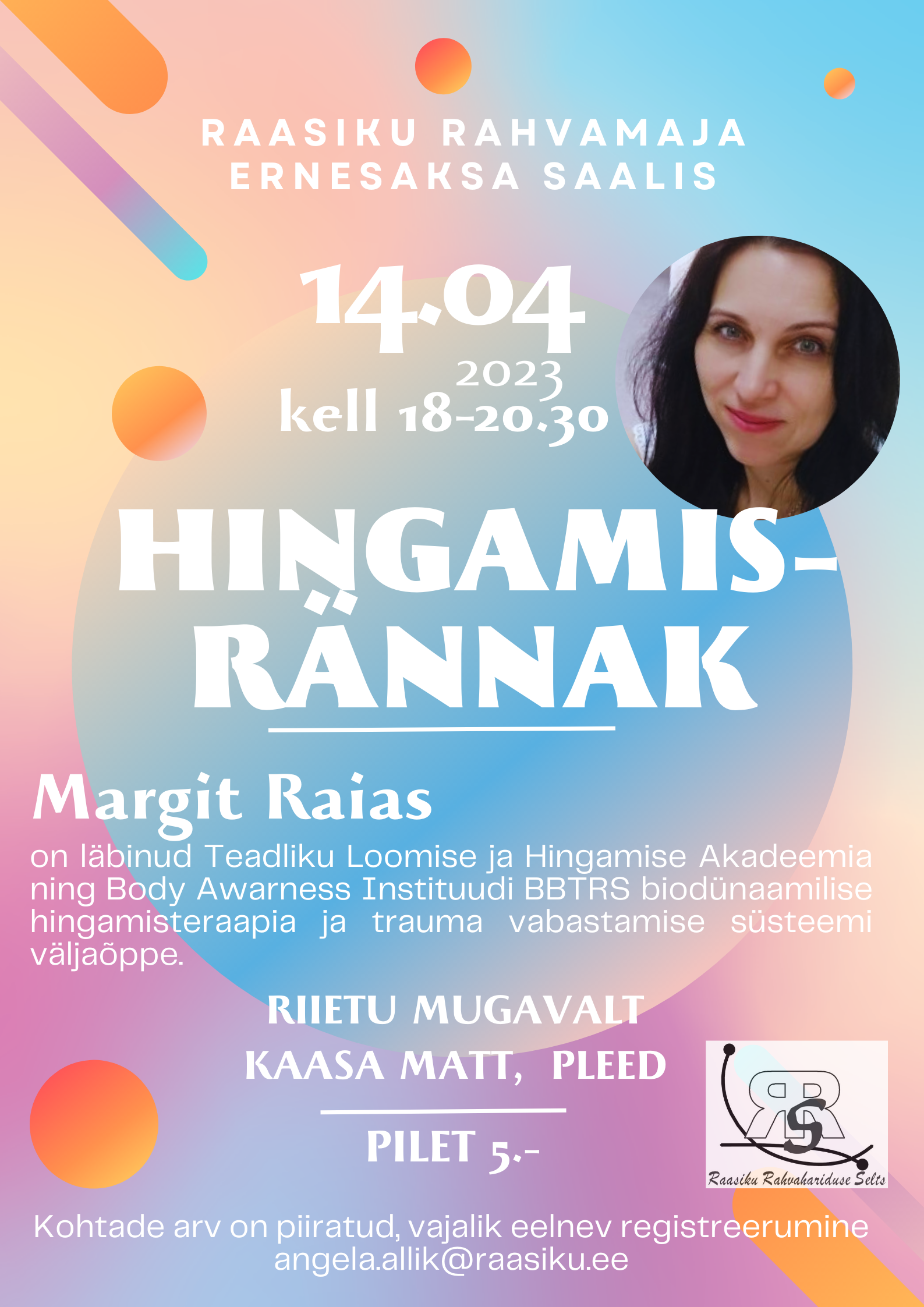 Hingamisrännakut viib läbi Margit Raias, kes on läbinud Teadliku Loomise ja Hingamise Akadeemia ning Body Awareness Instituudi BBTRS biodünaamilise hingamisteraapia ja trauma vabastamise süsteemi väljaõppe. Juhendab grupihingamisi ning individuaalseid hingamisseansse.